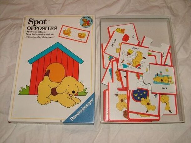 Simple memory-based game variant. Cardboard discs ('spots'), each with a certain word printed on one side, are placed face down on the gameboard. Each spot has a matching card which forms a pair; these cards are shuffled and form the draw pile for gameplay. A turn consists of drawing a card and finding the matching spot on the gameboard. Unmatched cards...