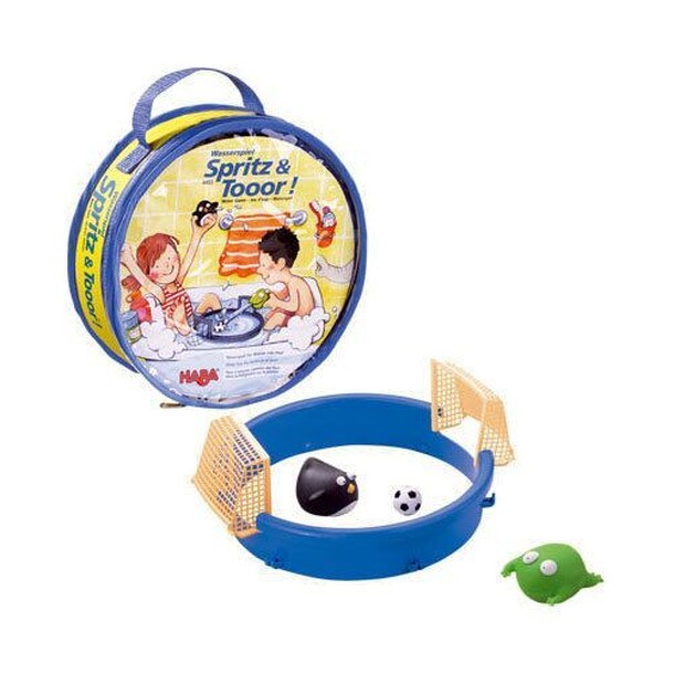Spritz Duell is water game to be played in a bathtub or a swimming pool, though it could be played in a sink as well. The "board" is a round plastic ring with a net attached. This is placed in the water and four flowers each of red and yellow are placed inside the ring floating. On "go", two players fill up their squirting animals (purple and green...