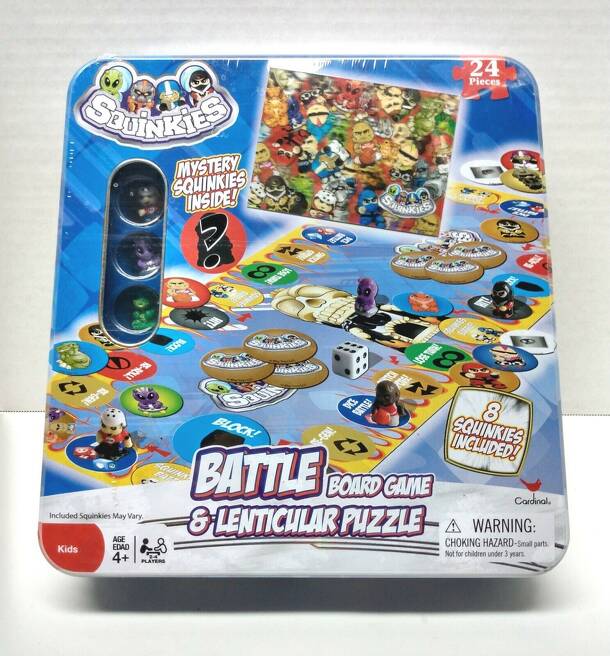 The object of the game is to capture 4 different Squinkies cards. Cards can be captured by landing on Squinkies spaces, or by winning Dice Battles against other players (when both land on a Dice Battle space), or by winning Squinkies Battle! spaces (by flicking your piece and moving another player's piece off the board). There are 6 different groups of...