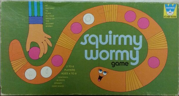 Squiggly Worms features a large plastic "apple" that contains 20 plastic worms inside of 20 holes. The apple is mechanically operated by pulling a lever (no batteries required). A player pulls the lever which causes the worms to move up and down, popping out of the holes. The player must grab the worms one at a time and check to see if the color on the...