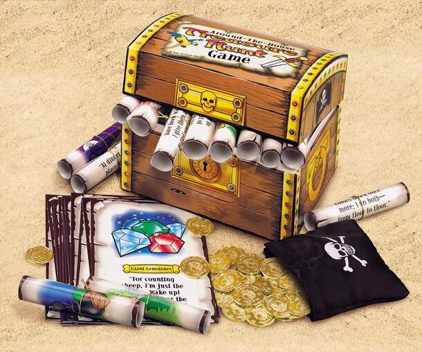 This game is a family game that puts a pirate themed spin on the cooperative treasure hunt. Players get one of several secret riddles printed up on scrolls. Once they solve the riddle and find the correct location, they then need to solve the next riddle they find there, and so on, until they find the hidden bag of treasure coins. Game components: -Game...
