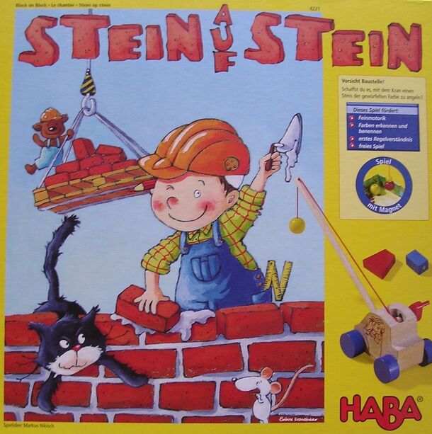 Entering this construction site is for children only! A wooden crane lifts smooth, wooden, colorful blocks around the construction site. Who will build the highest tower? A game of skill with color dice for 1-4 crane operators. With different levels of difficulty. Wooden crane and building blocks are suitable for free play and stimulate motor skills....