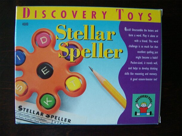From the box: "Quick! Unscramble the letters and form a word. Play it alone or with a friend. This word challenge is so much fun that excellent spelling just might become a habit! Pocket-sized, it travels well, and helps to develop thinking skills like reasoning and memory. A good esteem-booster too!" This game is similar to Boggle. It consists of seven...