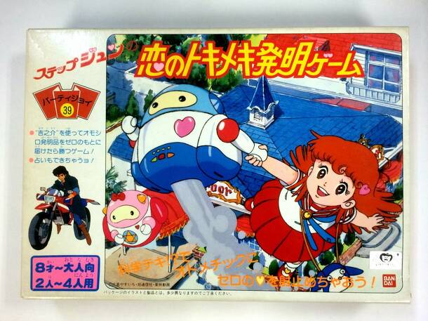Part of Bandai's Party Joy series of lighter boardgames. (#39) It made an TV animation a game. Chief character Jun is a girl of the invention enthusiast. Jun wants longed-for male Zero to come to like oneself. Each player becomes Jun, using robot Kichinosuke, competes for sending inv. to Zero. Each player take two pieces "Jun" and "Kichinosuke". Go ahead...