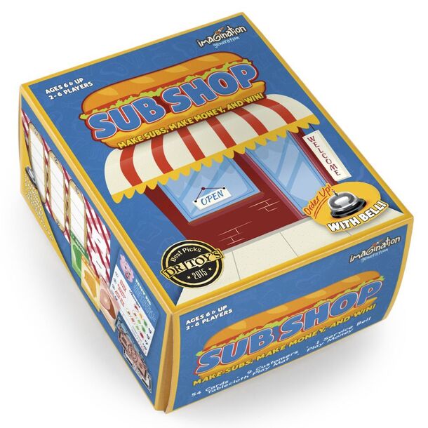 In Sub Shop, the game of competitive sandwich construction, use 8 ingredients to build 11 unique sandwiches to fill the picky and particular orders of 9 zany customers! Draw a customer card, read out their order, then lay your ingredient cards onto the real tablecloth game board. When you complete the whole order, ring the kitchen service bell, shout...