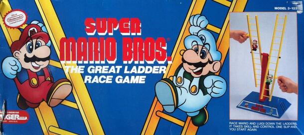 Players guide Mario and Luigi as they race down their ladders. The first one to reach the bottom of the ladder is the winner! The game comes with a blue platform with a vertical tower that holds the two yellow ladders. The ladders spin on the vertical tower. Mario and Luigi have hooks on the backs of their heads and legs so that they can latch on to the...