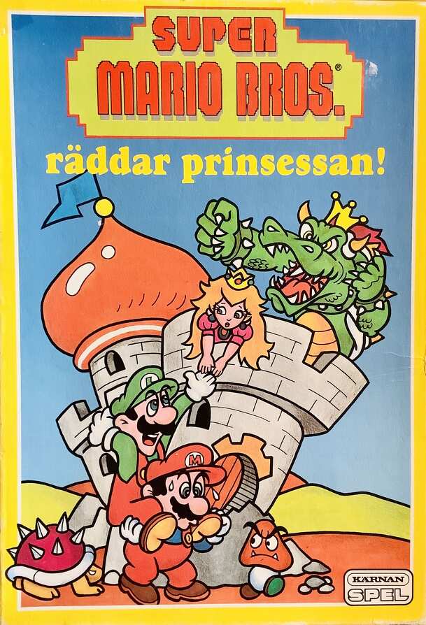 From the back of the box: "Super Mario Bros. Blockbusting Card Game!! 50 cards featuring those zany, wacky characters from the unique world of the Super Mario Bros. Turn over the cards, collect the gold coins and be the first to collect the correct amount. BUT BEWARE, turn over the wrong card and you could lose some coins, or all of your coins, or even...