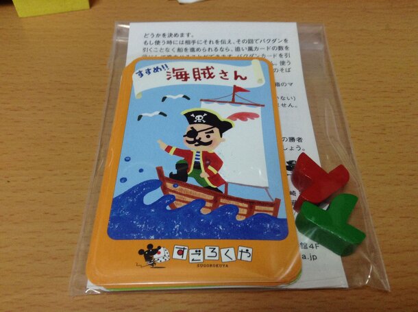 Susume Kaizoku-san ("Go! Pirates!") is a 2-player racing game that each player takes the role of pirate. The board is made up by 5 cards and each player receive the hand of 3 cards (1, 2, and bomb). A player draws cards from other player's hand one by one. Then he/she moves his/her ship for the number of the spaces equal to the sum of the values on the...