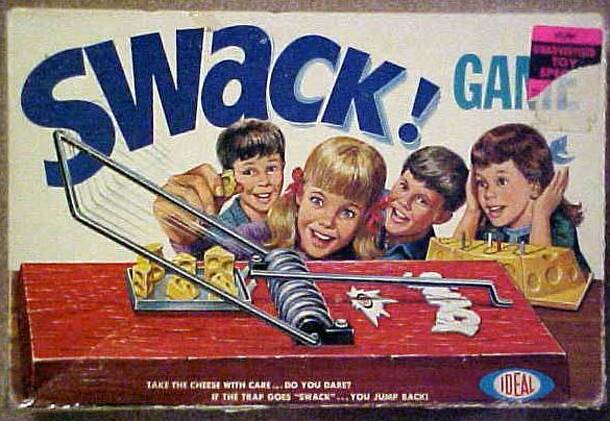 Swack is Ideal's wacky, new game that's loaded with action. What happens when you take the cheese off the giant trap...just wait and see. You might move ahead on the big cheese scoreboard or you might move back if the trap goes swack. On a player's turn he or she can take up to 3 pieces of cheese from the pan. The player must take at least 1 piece of...