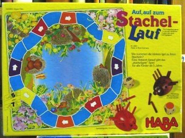 Up to four wooden hedgehogs (without any spines at the beginning) are running around a circular track. The movement is determined by dice (1-3 squares onwards), which could also show a color symbol. In that case, a spine in that color can be added to the hedgehog; the same happens when a hedgehog reaches a color square. When hedgehogs meet or a hedgehog...