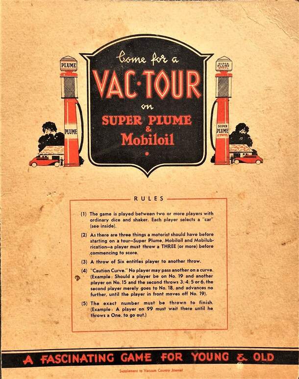 Vac Tour is an Australian promotional board game for the Vacuum Oil Company that was established in Australia in 1895. The game was a supplement to Vacuum Country Journal. A simple roll of the dice and move game that sees players move cardboard cars through rural Australia that have kangaroos and Emus among Vacuum Oil depots and signage. Players cannot...