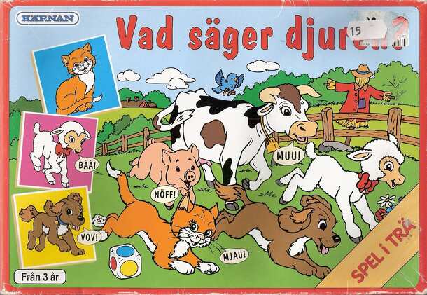 From the box: Game for small children to help them learn about animals and what sound they make. Each player gets a board with 5 animals on it - sheep, cat, cow, dog and a pig. Each animal has a different colored background. Then all wooden tiles are shuffled. Each tile has a picture of an animal on one side, a colored circle on the other side. All tiles...