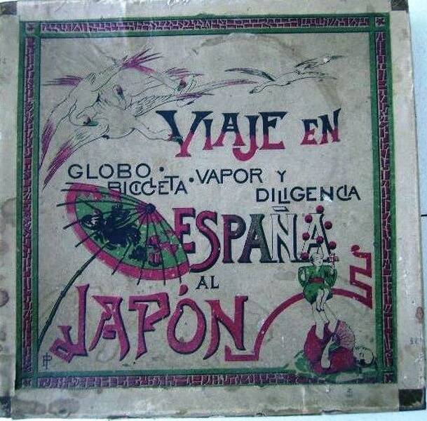 Viaje de España al Japon en Globo, Bicicleta, Vapor y Diligencia (eng. Travel from Spain to Japan with Balloon, Bicycle, Steamboat and Stagecoach) is a vintage spin and move game published in Spain. Players spin the spinning die with 4 paintings on the sides: Balloon, Bicycle, Steamboat and Stagecoach. Player could travel around the board only with that...