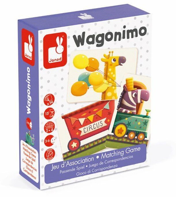 With the Janod Matching Game, Wagonimo you must be the first to reconstruct your 5-carriage train with all of its animals by taking it in turns to roll the dice. During each turn kids roll the action dice and add to his train a wagon or an animal: when the train is complete with 5 wagon and 5 animal on it the game ends. Players gain points with an animal...