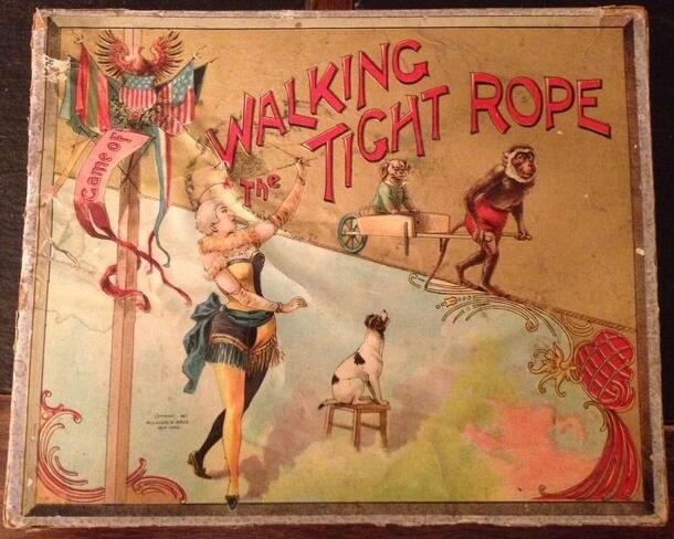The images and story for the game include the most famous tight rope walker of the time, Blondin. Charles Blondin is famous for first walking across Niagara Falls Gorge on a tight rope in 1859. He would later walk across numerous other times and entertain the crowds by crossing blindfolded, on stilts, or with his manager on his back. Game board shows an...