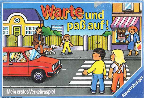 "Wait and watch - my first Traffic game" is a dice game for teaching traffic rules to preschool and early primary school children. A double sided board depicts 2 street scenes - 1 side showing a street with a zebra (pedestrian) crossing and the other side a street without a crossing but with 4 "waiting" zones. The players must move via dice rolls from...