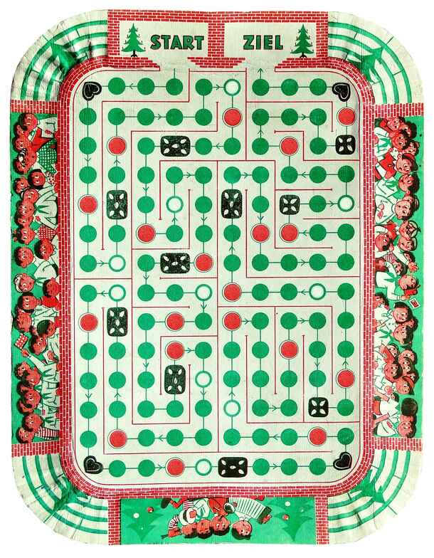 The players have to skate from start to finish. Movement is determined by a die. If a player lands on a white space he has to move backwards on his next turn. On a red space the player topples and misses a turn. If he land on a ginger bread he may roll and move again. The first player to reach the finish wins the game. The game board may be folded into a...