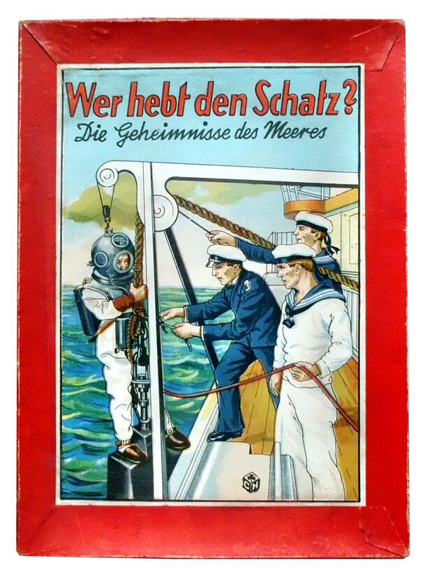 The players start at the ship, then dive to the wreck on the ocean floor and come up again to the ship. The first player to achieve this, wins the game. Movement is determined by two dice. If one of the diece Shows a 6, the shark (black meeple) is placed on the black space on the diving track and blocks any movement of the diver. It stays there untill...