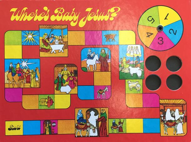 Where's Baby Jesus? is a simple children's game where players spin the spinner and move the indicated number of spaces. When they land on a space that shows a picture with a missing object, they can then immediately move to the space that shows that missing object. The first player to reach the final space on the board wins the game. As described on the...