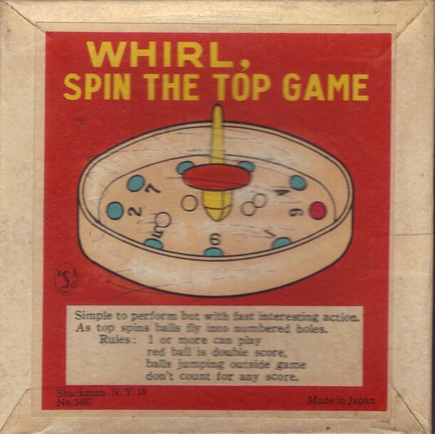 A spinning top game distributed under Shackman's name. I've seen a couple of different boxtops for the game. They all seem to be made in Japan, so I'd guess after WWII, so circa 1950 for the games. Basically there is a concave bowl which has balls which are knocked in holes with point values along the edge of the bowl area. —user summary Simple to perform...