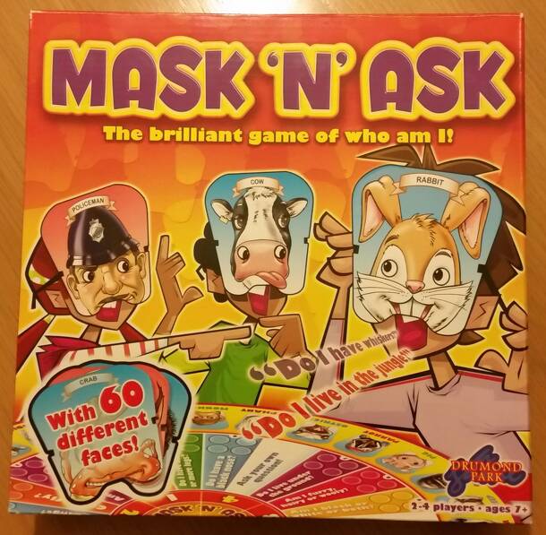 To find out the character on the mask you are wearing by moving round the board and asking the questions shown on the playing spaces you land on. Each turn you move and ask the question you land on - then take a guess. You keep track of the answers with your handy YES/NO counters. Quick to learn and great fun to play, Mask ‘n’ Ask is a hugely entertaining...