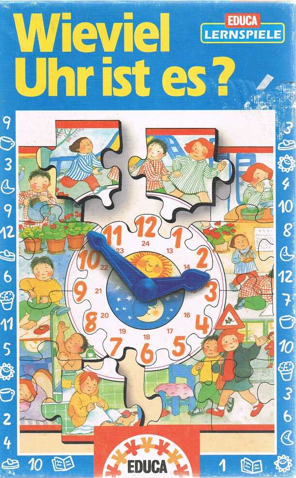 Children's game to help them learn to tell the time. The main game is a race to complete the jigsaw that makes up the board. Depending on age, allow a player 1 or 2 minutes to finish the jigsaw. The fastest wins. The jigsaw features a clock in the centre with moveable hands, and around the clock are activities associated with the time of day. In the second...