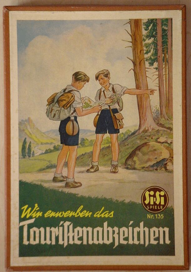 Objective: be the first reaching target space (Berlin) - moving by turns - simple 'Roll & Move' game; you may choose (depending on the very first die roll) one of 3 different routes (car/Train/plane) to travel to Berlin; ending on a marked space follow instructions. remarks: very cost saving publication (1949!) => map, instructions, slipcase. Instructions...