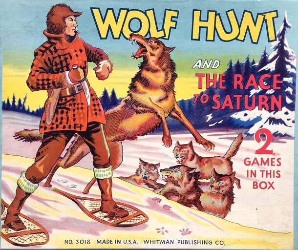 Two simple spin and move games in one box. Wolf hunt is on the box bottom. It's a two player chase game. One player is the wolf and one the hunter. If the wolf reaches the home den the wolf wins. If the hunter lands on or passes the space occupied by the wolf player, the hunter wins. In a four player game there are two wolf players and two hunters. Once a...