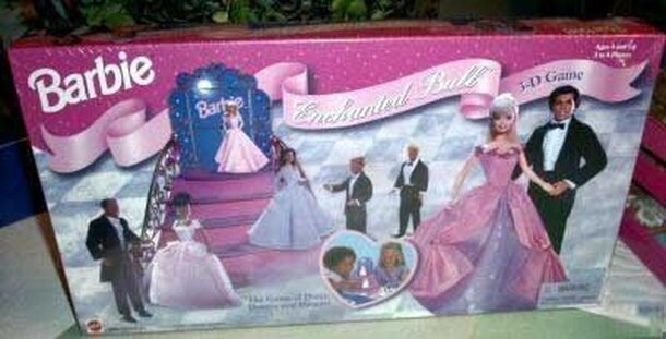 Barbie attends an enchanted ball in this Cinderella type game. Players use a spinner to move their Barbie pawns across the game board. When they reach the staircase, they descend it and spin to select their date (a prince natch.) Once on a date spot, you win by drawing a cloud card that matches your Barbie pawn. You then place your pawn and her prince on...