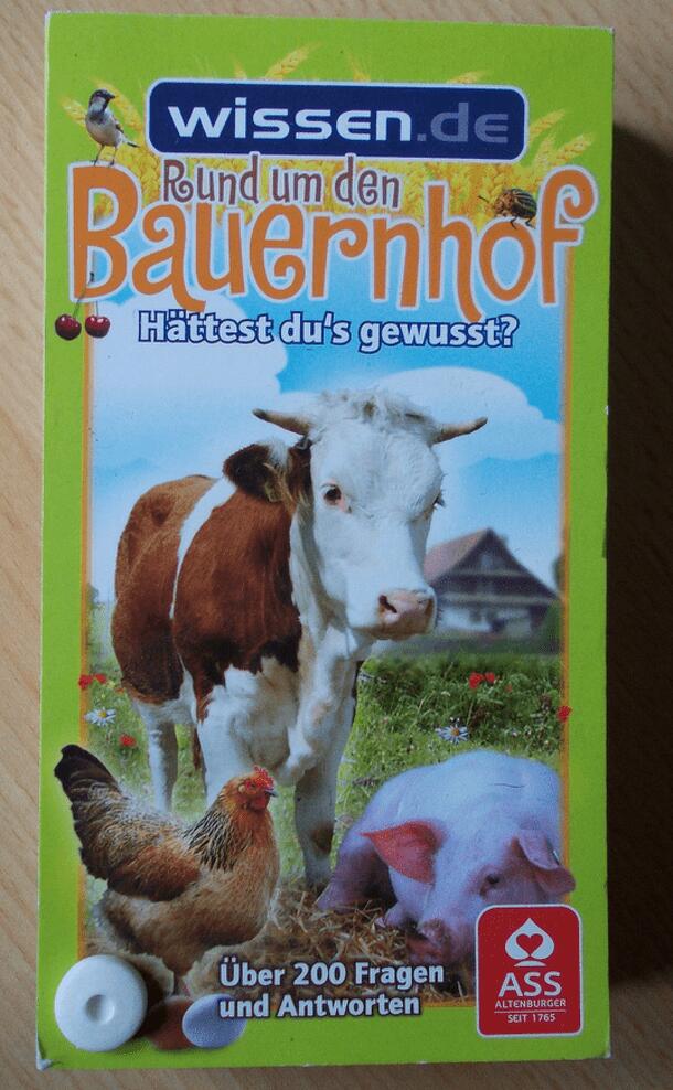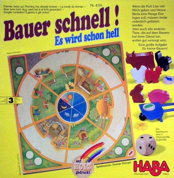 Children's game, Ages 3 and up. Farmer Klaus has accidentally mixed up all of his seeds (represented by wooden discs with pictures). On your turn, you throw the die, which will either show one of the types of seed (barley, oats, wheat, or rye) or a mouse. In case of a grain, you find a disc with the right type of grain and put it in its own bag. If it's a...