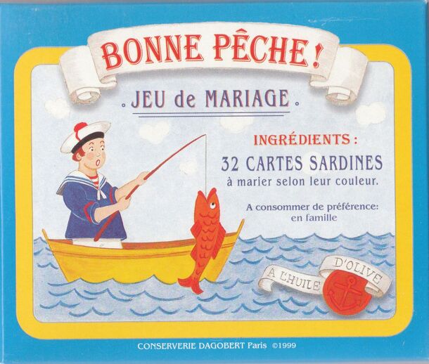 Card game featuring 32 Sardine cards in eight sets of four. It is not related to the hobby of Fishing, but there is a set of four fishes going fishing! Rather cannibalistic I think. Each player gets 5 cards. Players must ask each other for certain cards and if four from one set are completed, that set is considered 'caught'. When asked, if you do not hold...