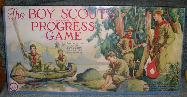 This is an old track game that depicts the players rise through the Boy Scouts. Players start at different board locations on the outer circle track. Dice are rolled, and ALL players simultaneously move the amount indicated. If you land on a space containing an Honor Check (merit badge), you take it and place it in front of you. These all have different...