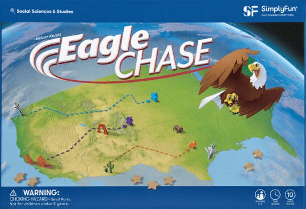 In Eagle Chase, players move around the board with their die roll and with the actions on their cards visiting locations throughout the United States. Interesting geographical and historical facts are read out loud as players visit the destinations on their cards and when they catch up with the Eagle players earn a Star Token. Cards are worth one point and...
