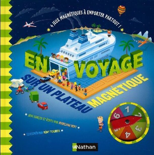 Four games together in one book with magnetique pawns and a spinning wheel as die. Easy to take along on vacation, at home or while driving, to pass the time while you're doing the riveting world tour. In one game you discover the world and it's different continents. In another game you learn the various ways of travelling: By car, train, boat and air...