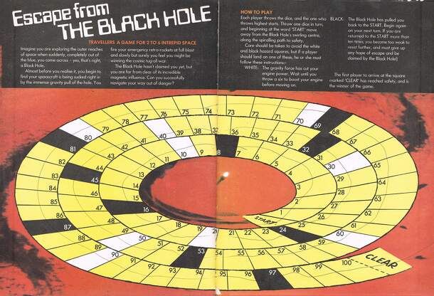 Game in The Black Hole Annual 1981, a Disney Corporation film. A simple race game. The track has 100 spaces. Most spaces are fine. However, if you land on a white space, you find that the gravity force has cut your engine power. You must stay on that space every turn until you throw a 6 which boosts your engine power and allows you to carry on with your...