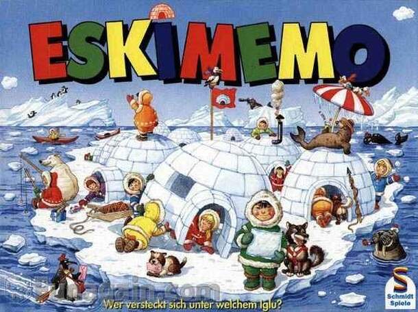 Memory game with plastic igloos, cardboard Inuit, and a die. The first player to hide all of their Inuit in the igloos wins. Each player rolls a die and then puts as many igloos on his or her Inuit as the number on the die. Because the igloos are so small, you can only fit one Inuk in every igloo. And, of course, there are never enough igloos to go around....