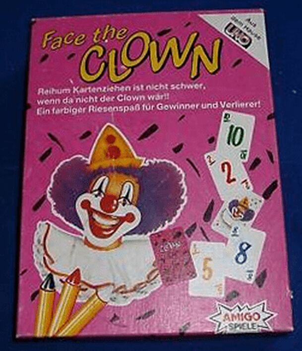 Variant of "Old Maid" - the players draw a card from their neighbor, and when a pair is found, this is discarded. The last player to hold a card loses. Losing means that the other players use the included facial pens to start painting the losers face (cheeks, forehead, chin, nose). The first person to lose four rounds therefore looks like a clown and loses...