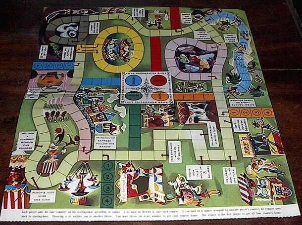 Promotional game published by J S Fry & Sons, a leading manufacturer of chocolate at this time (most famous for the TV adverts for "Fry's Turkish Delight). A basic roll and move game, taking ideas from Ludo in some places. Each player has four men and their designated start point. The board track covers various encounters with fairground attractions. When...