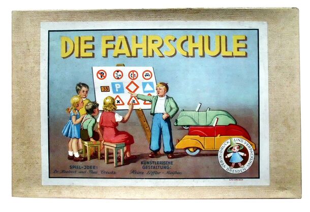 The players start at the Driving School at space A and have to traverse the game board till they arrive at space E back at the Driving School. On several spaces the players get points, penality points, obstructions or benefits. The first player to arrive at space E gets 12 poits, the second 6 points, the third 3 points and the rest get 1 point. The player...