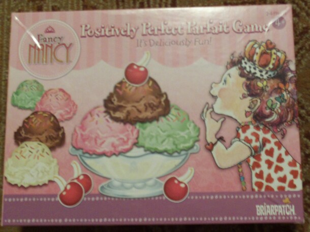 Fancy Nancy themed game. Players take turns Spinning the spinner to collect at least three different flavors of ice cream in their dish then top it off with a cherry. The spinner has the 4 different ice cream flavors spots, two cherry spots, an Oops! spot, and a Switch a Scoop spot. Players begin with an empty dish. Play begins with the person wearing pink...