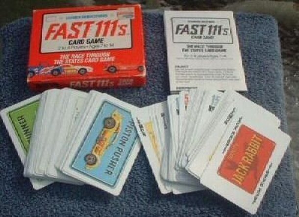 It's a fast-paced race through the U.S.A. along a route that you create. Lay out the license plate cards of the states you will pass through...choose your Fast 111's racer cards...and the competition is on! Try to leave your opponents "in the dust" while you build up your own speed. Hit the maximum and you're on to the next state. The speed and excitement...