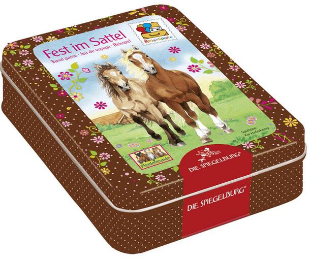 Fest im Sattel is a simple horse-themed roll-and-move game for children. It comes in a tin box whose lid is used as a board. The board shows a racecourse (shaped like an eight placed inside/onto an oval, with an extra circle inside one of the halves of the eight). Each player puts his/her horse token on the start space. Players take turns rolling the...