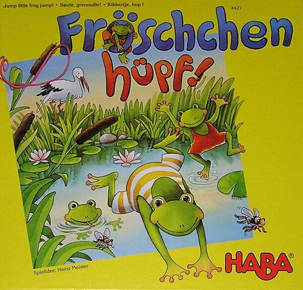 "Fridolin-Spiele in der Tüte" Nr. 8 (between 1921-1928) The frogs sit on the four green spaces. The flys start at the upper left corner. Each player has five flys, but only one of them in play at any time. If a fly gets eaten or catched the player starts with the next one. If a player gets a fly on the nose of the human figure in the center of the game...