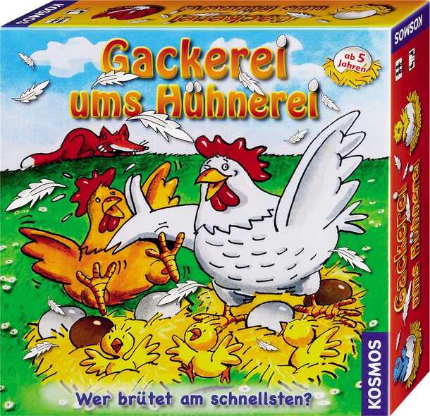 Gackerei ums Hühnerei is a easy fun game for children. Players are sitting on 5 "egg" cards, which are placed top down on their chair. A dice is rolled and shows if a red, yellow or blue biddy should be hatched. Simutaniously all players uncover their eggs to find the right biddy and place it in the nest. The fastest player gets his egg as a VP and takes...
