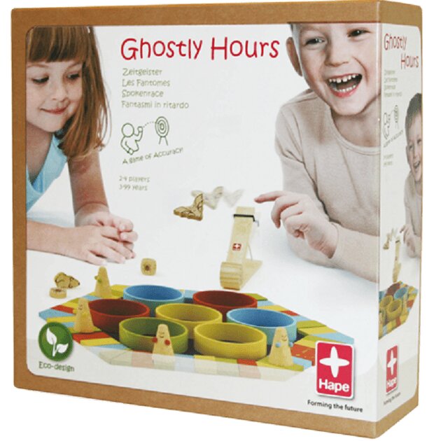 It is midnight and the ghosts can hardly wait to go to the graveyard for a night of fun but they have to be home on time. Players take turns moving around the board with the help of a rat, bat and spider. Flip the play pieces into the colored bamboo rings and move to the next colored tile of the same color. Players who reach back in time win. Players who...