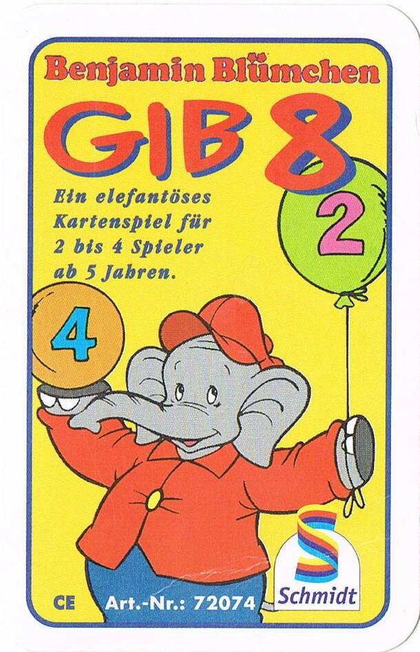 Children's card game featuring Benjamin Blümchen. From a hand of cards, each player adds a card to the face-up stack pile. The card added must be either the same colour as the previous card (thus changing the number) or the same number (thus changing the colour. Being a game for youngsters, after they have made a legal play, they can then add any other...