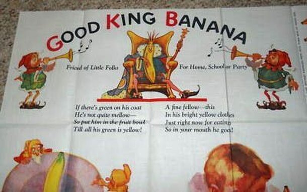 A children's game modelled on pin-the-tail-on-the-donkey, only in this case, the object is to pin bananas in the proper place on a linen-like cloth with bright lithographed cartoon-like characters and the image of a boy holding a banana. Bananas with green tips go into the fruit bowl, bananas that are all yellow and ripe go into the boy's hand. The players...