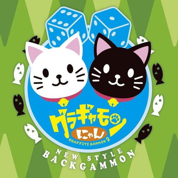 Graffiti Gammon 2 (グラギャモンにゃん) plays like traditional backgammon, but the game board is designed for easy set-up and playing for those new to the game, with numbers circling both directions on the board to making counting off easier. The player pieces are wooden cat heads, and the idea is that you're moving cats off the edge of the board to catch the fish...