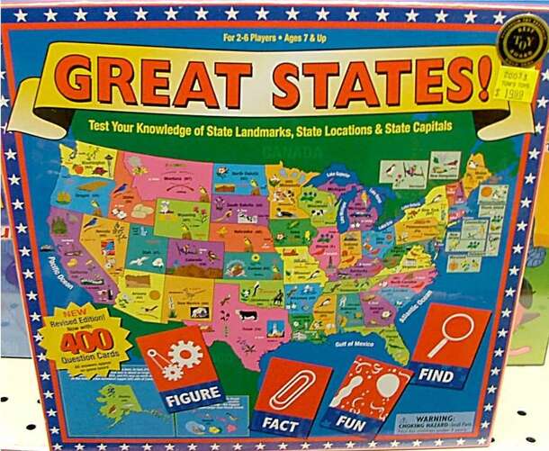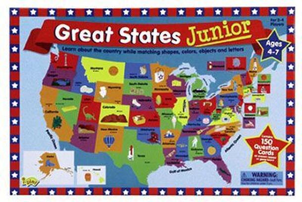 From the publisher: Based on the best selling game, Great States!, this junior version provides the same fun, hurry-up action while introducing young players to the map of the 50 states. Find the shape! Find the picture! Find the name! Kids will have a blast searching the game board to find where things are as they travel along the red, white and blue game...