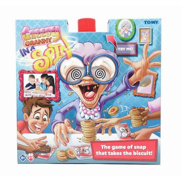 Players swipe treats from Granny's tray and push the button on her chair - you never know when she will wake up and send her teeth soaring! On your turn, you spin the spinner. Landing on green lets you steal a treat from Granny's tray and then press the button a number of times. Landing on purple makes you put a treat back on Granny's tray then press the...